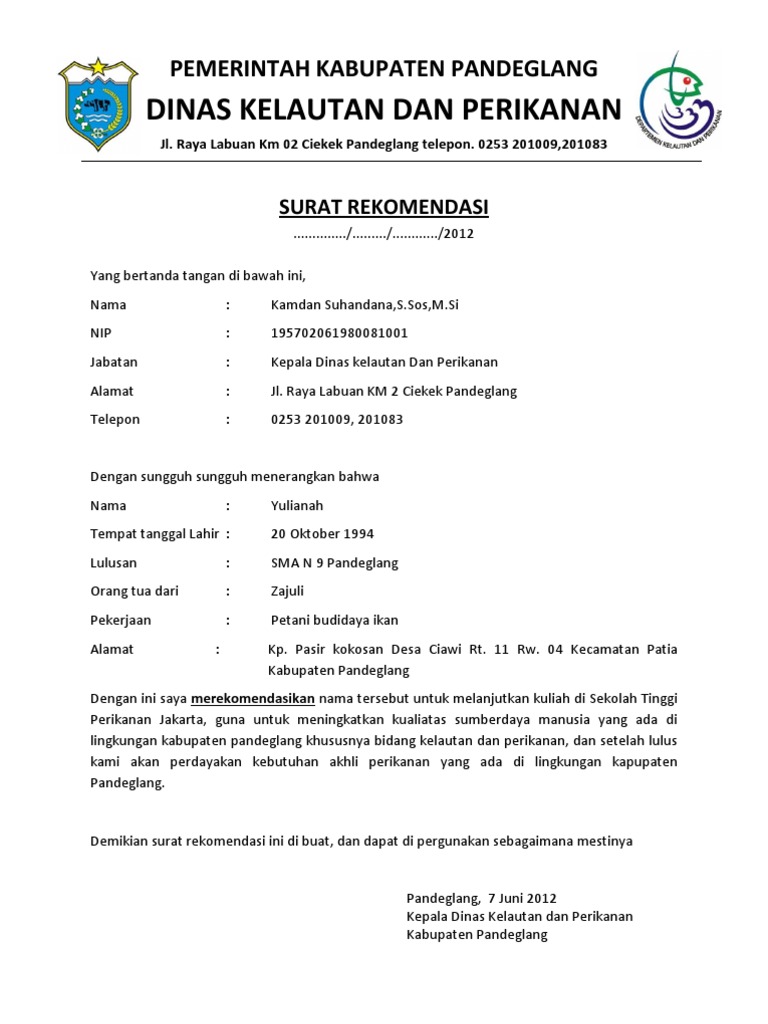 Salam ta'dhim kami haturkan semoga kita senantiasa dalam lindungan dan hidayah allah swt.selanjutnya,berdasarkan surat permohonan rekomendasi pr. Demikian surat rekomendasi ini dibuat dan dapat dipergunakan sebagaimana mestinya. Surat permohonan rekomendasi merupakan surat yang dibuat oleh perseorangan ataupun kelompok dengan tujuan untuk memohon diberikan rekomendasi atau rujukan kepada pemenggang tanggung jawab dari suatu instansi atau perusahaan. Surat rekomendasi dapat dibuat untuk berbagai keperluan, seperti surat rekomendasi kerja, surat rekomendasi mendaftar studi lanjut (s2/s3), surat rekomendasi kegiatan, surat berikut adalah salah satu contoh surat rekomendasi kerja yang bisa kita perhatikan format penulisannya Penjelasan lengkap seputar contoh surat keputusan yang baik dan benar.